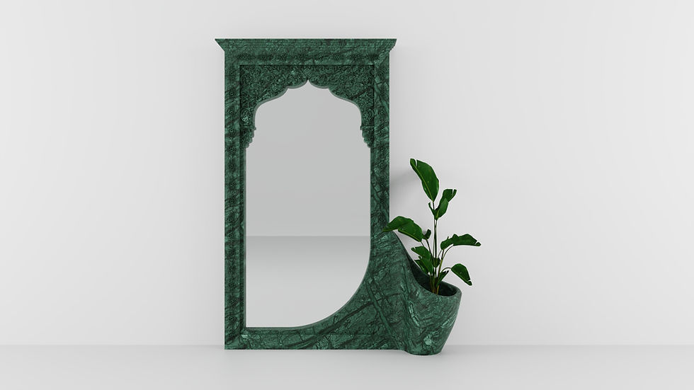 JinaShilp mirror transforms reflection into an intentional and contemplative experience. Designed by Karan Desai for Serafini, the piece draws inspiration from temple arches, reinterpreting their form into a vertical structure that frames the act of looking. The mirror is not conceived as a purely functional object but as a moment of pause within everyday living. Its presence encourages introspection, aligning with philosophical ideas of self awareness and reflection. JinaShilp mirror becomes an architectural element that shapes perception, creating depth and stillness within contemporary interiors. Produced by Serafini, it embodies a vision of marble design where function and meaning converge.