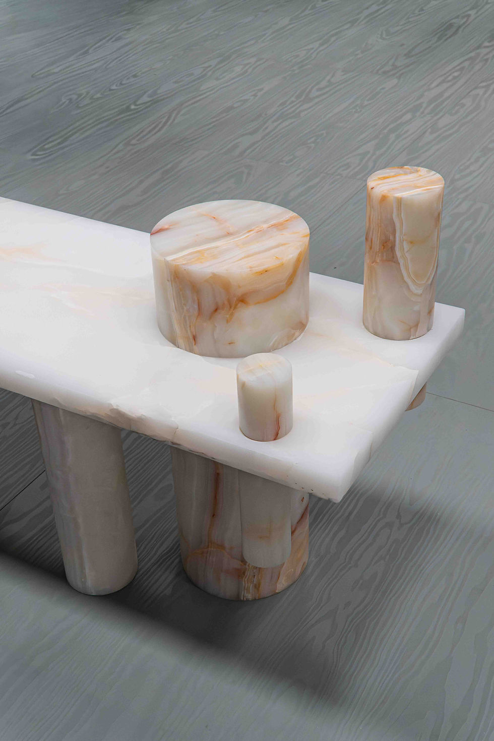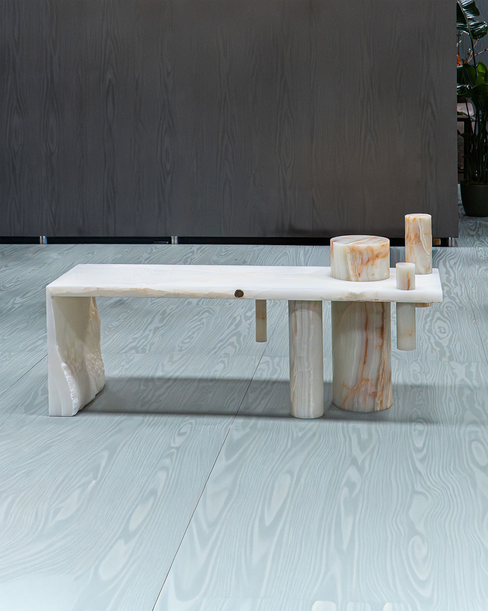 JinaShilp and Pillar bench is conceived as a physical and symbolic intersection between two distinct cultural identities. Designed by Karan Desai and Spinzi for Serafini, the piece brings together two design approaches into a single continuous form. One side reflects the vertical, layered and introspective language of JinaShilp, while the other expresses the architectural rhythm and modular clarity of Pillar. The bench becomes a point of transition where these two worlds meet without losing their individuality. JinaShilp and Pillar bench is not simply a seating object but a narrative of coexistence, where design becomes a medium for dialogue. Produced by Serafini, it embodies a vision of marble design that celebrates diversity while finding unity through form.